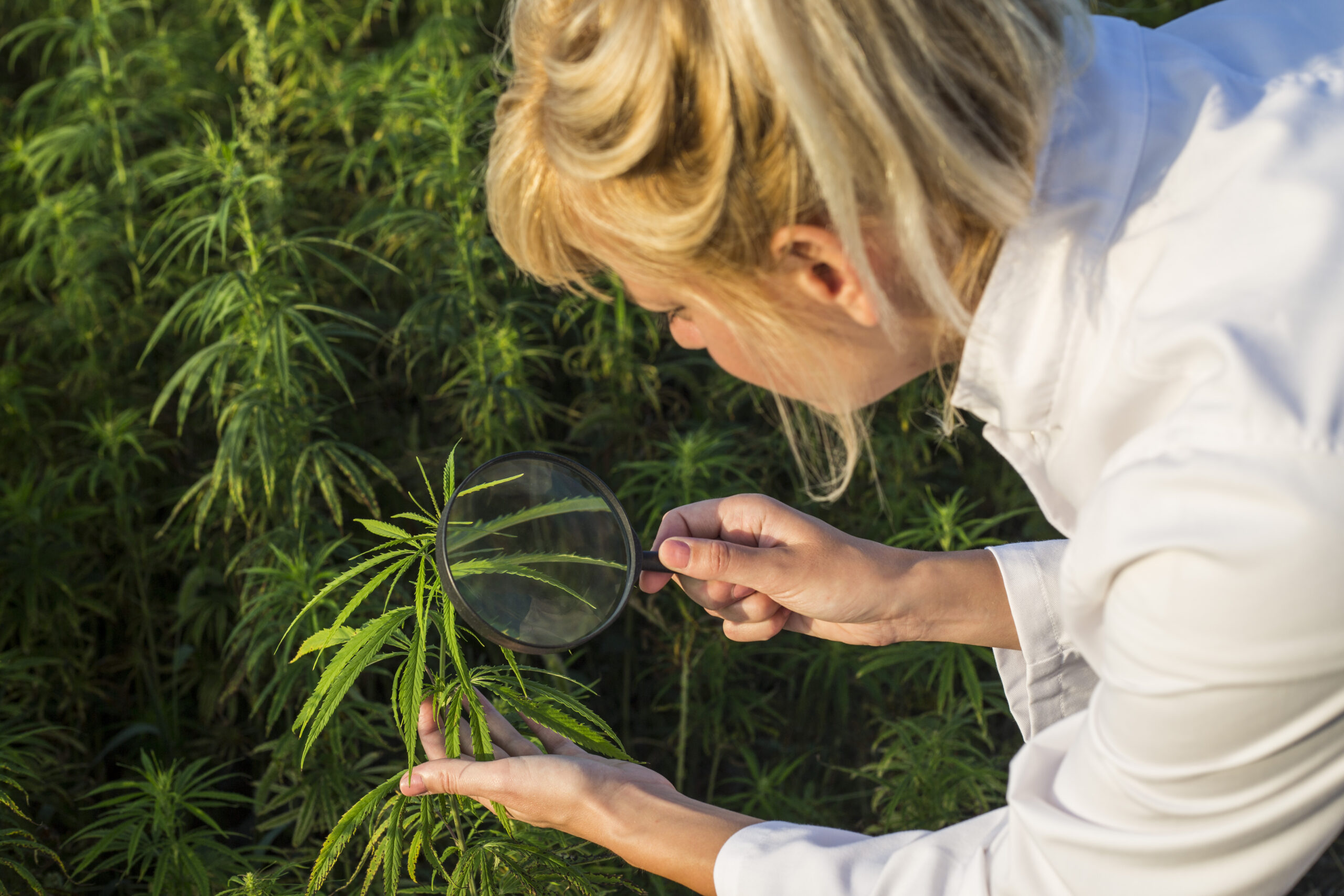 Scientist with magnifying glass observing CBD hemp plants on marijuana field