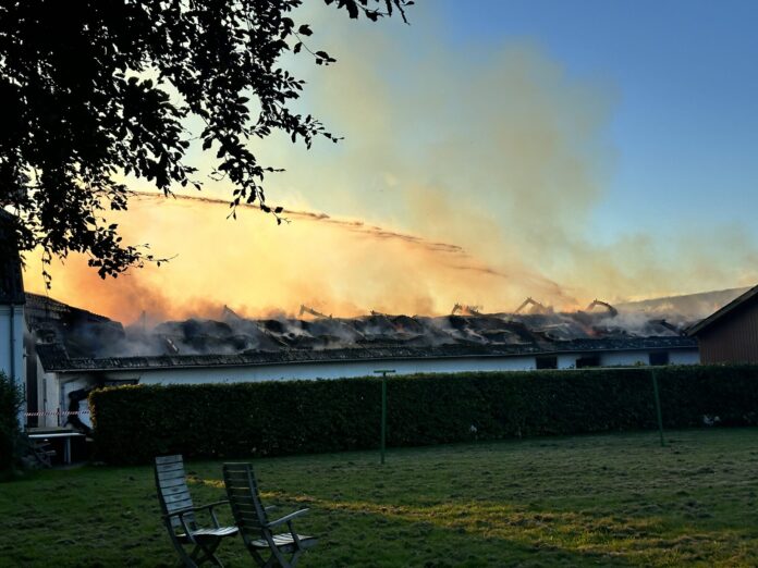 Branden startede i lades sydlige ende og fik lade til at overtændes. Brandvæsenet fik branden under kontrol, og der er nu en brandvagt på stedet, da det stadig ulmer.