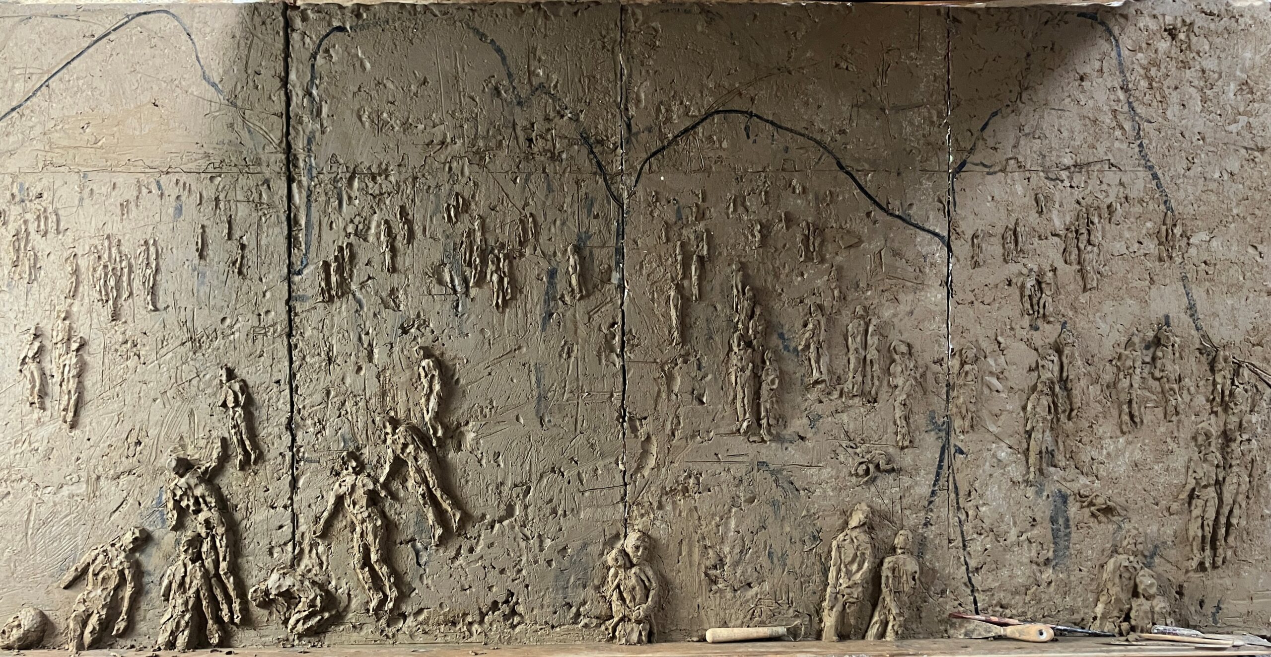 Udstillingen rummer også en reol fyldt med hans skitsearbejder – genskabt, som den står i hans atelier i Ribe. Det er som at træde ind i kunstnerens eget værksted, hvor leret ligger i bunker som hukommelse, og hvor figurerne står og kigger efter én, som om de spørger, om man har tid til at lytte.