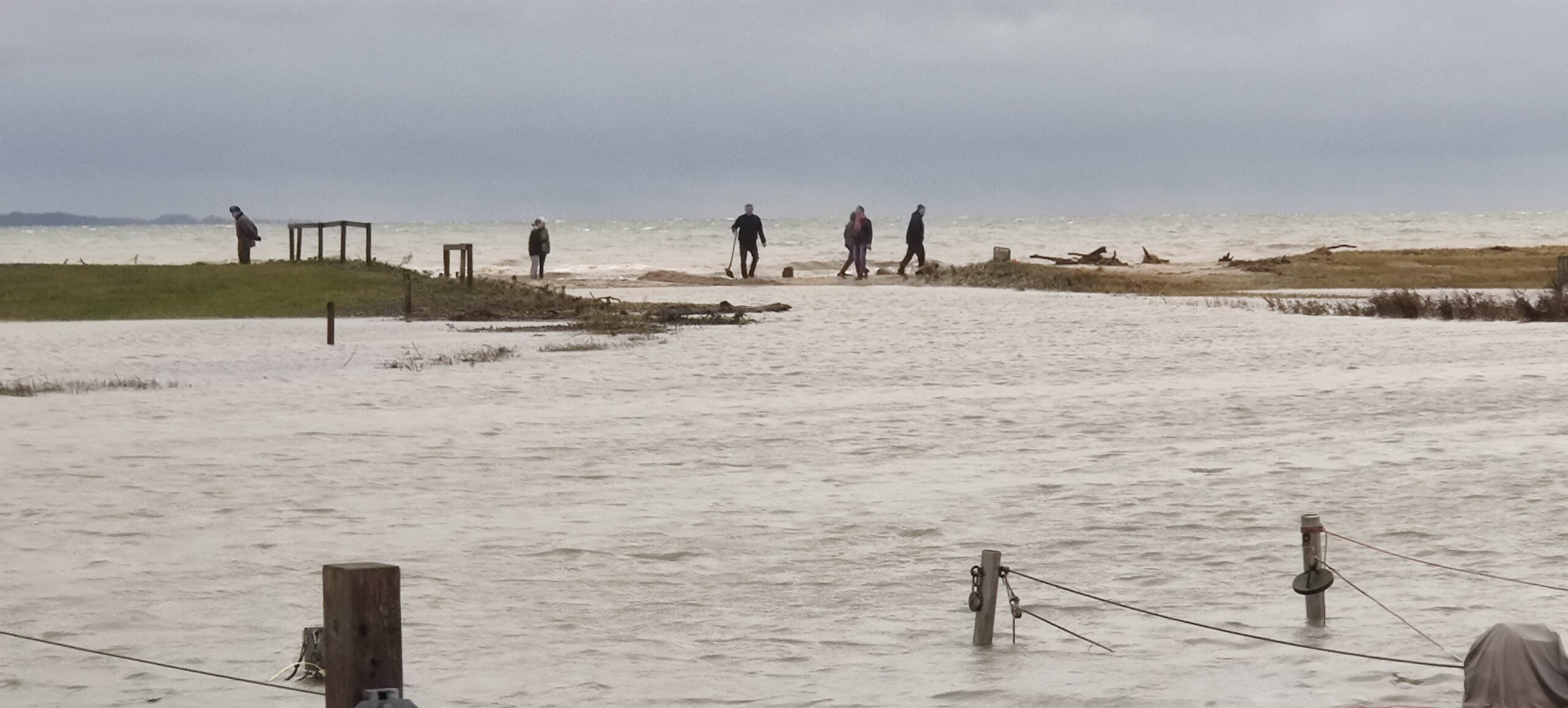 - På grund af det fortsatte højvande, har frivillige sat spaderne i jorden for at grave en rende, så vandet kan drænes ud af udmundingen.