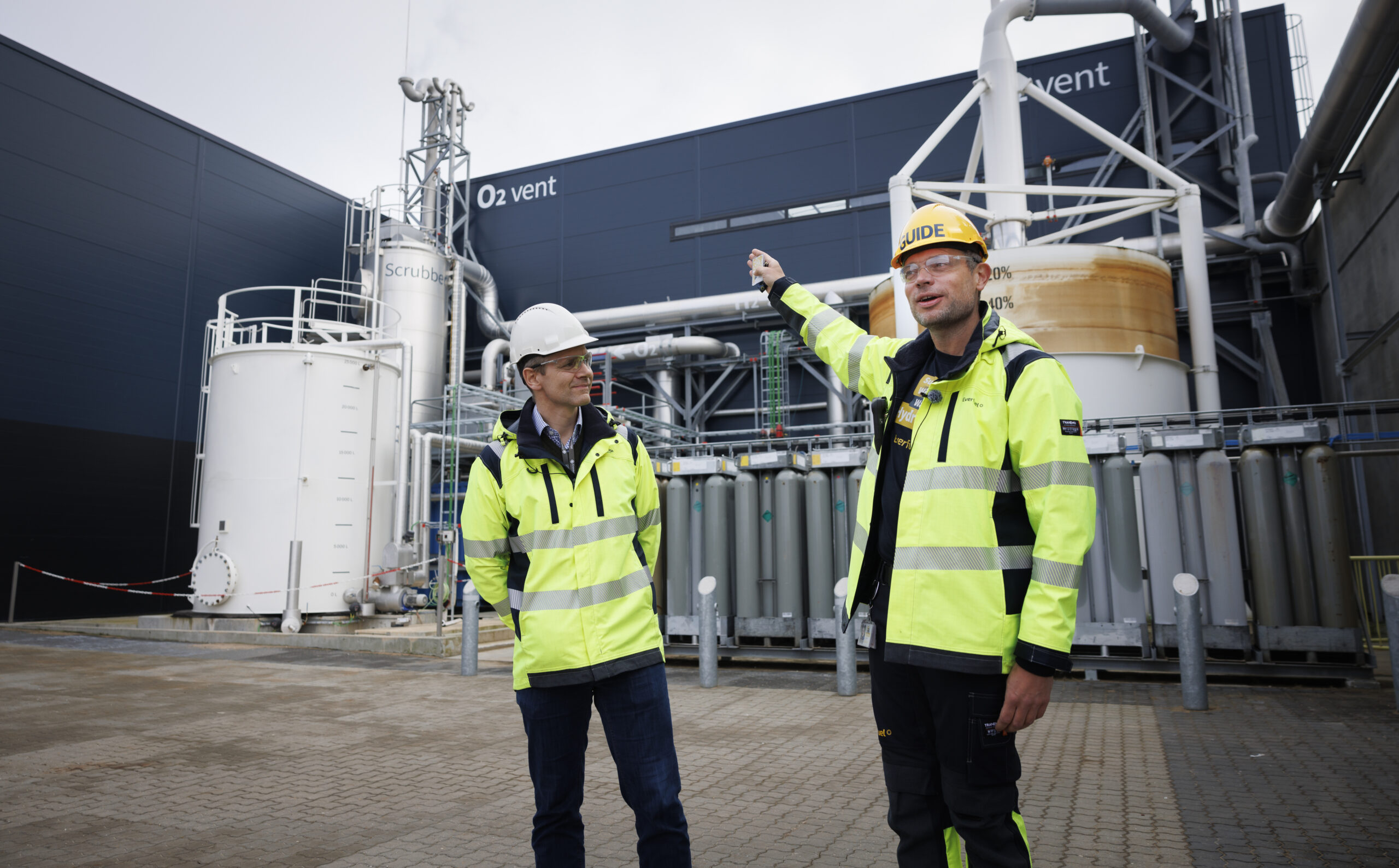 Efter en tur rundt i anlægget iført sikkerhedsveste og briller afsluttede Finn Schousboe og Jacob Krogsgaard turen med et blik ud over området fra rooftop, hvor de funderede over projektets betydning. Det er en historisk milepæl, sagde de – ikke kun for Danmark, men for Europa og muligvis verden, når man ser på produktionen af grøn brint som en erstatning for den sorte brint i raffineriprocesser.