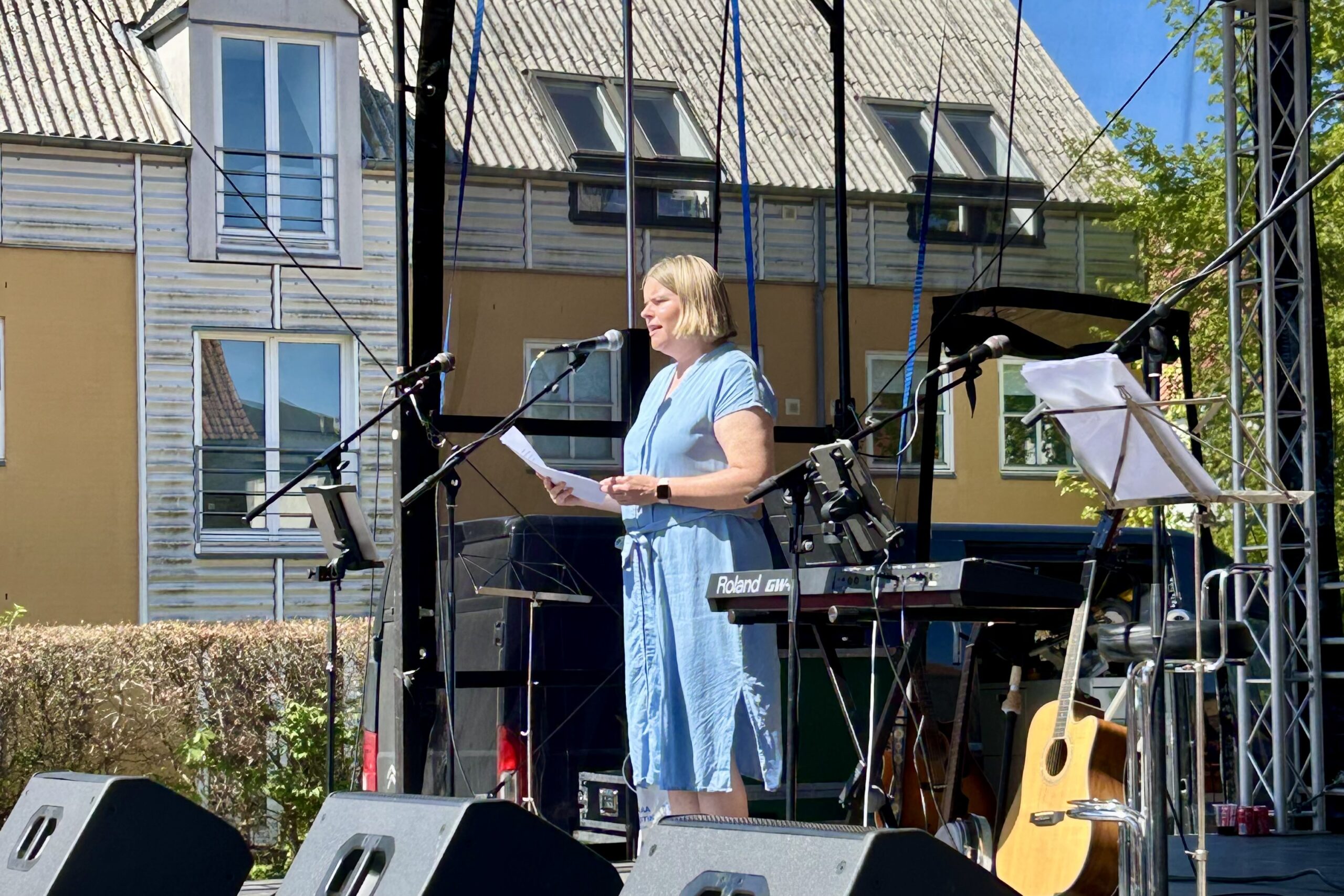 »Sikke et fantastisk vejr, vi har bestilt i dag,« lød det indledningsvis fra Malene Søgaard-Andersen, der med et smil kiggede ud over den tæt pakkede plads. Selvom hun fik den opmærksomhed, som enhver politiker kan drømme om på scenen, var den dog en smule sværere at fastholde blandt publikum. Rundt omkring stod folk nemlig med ansigtet vendt mod solen, optaget af at hilse på hinanden, skåle i kolde drikkevarer eller småsnakke om weekendens gøremål.