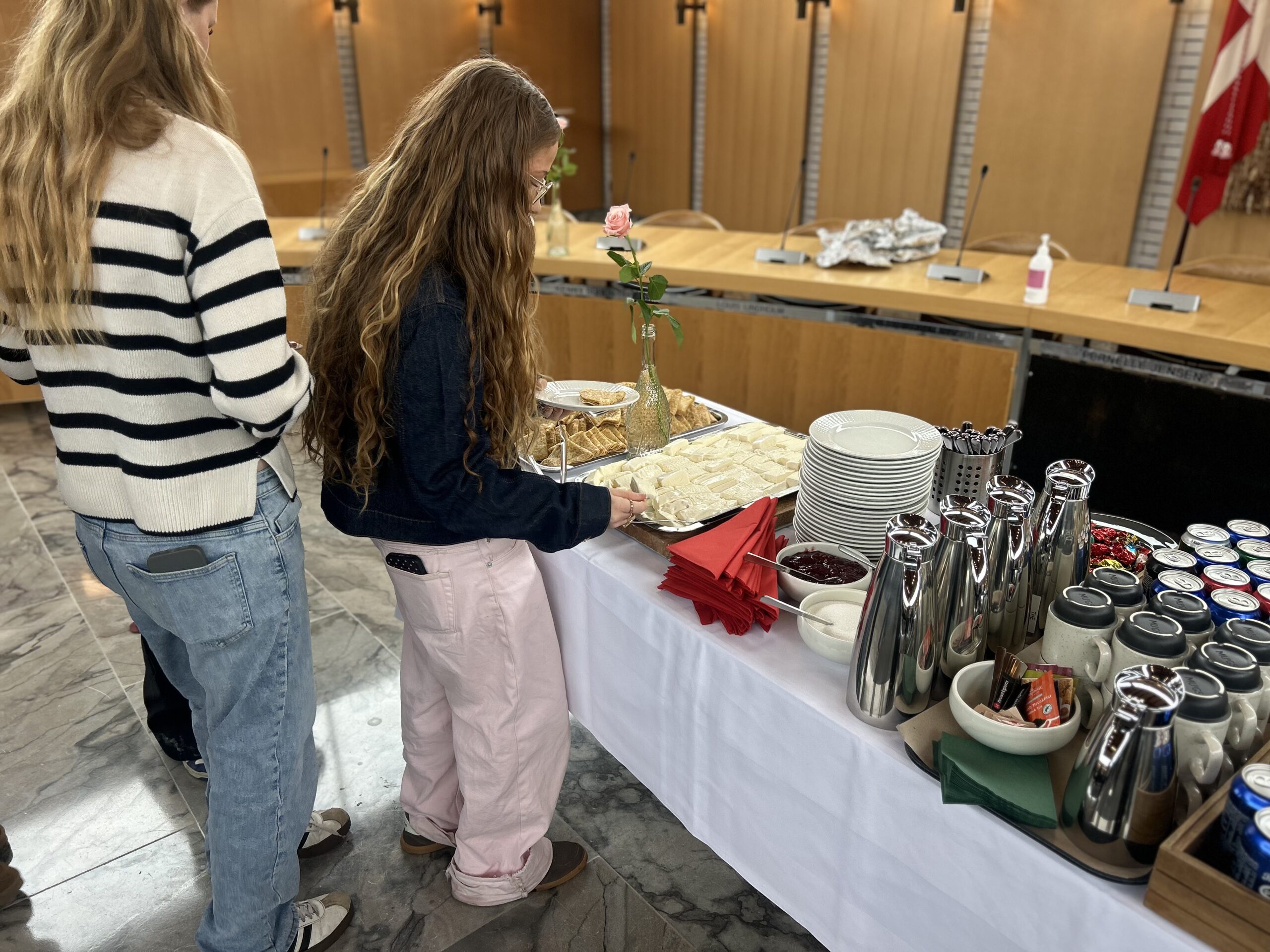 Anna Fridas klasse fik en gave med fra byrådet, og så blev der serveret pandekager og is i byrådssalen. Den formelle tone blev hurtigt afløst af den slags summen, der opstår, når en flok syvende klasses-elever får pandekager midt på en torsdag. Anna Frida selv tog det hele med et smil. »Det er meget sjovt og også meget anderledes, at man har fået hele ens klasse og venner og familie inviteret med herop,« sagde hun, mens pandekagerne blev fordelt omkring hende.
