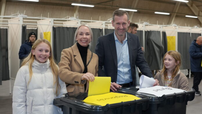 Fredericia Idrætscenter summede af energi og spænding, da Peder Tind fra Venstre trådte ind af døren for at stemme sammen med sin hustru og børn. Der blev hilst til alle sider, hvor han blev genkendt af mange, mens han banede sig vej mod stemmelokalet.