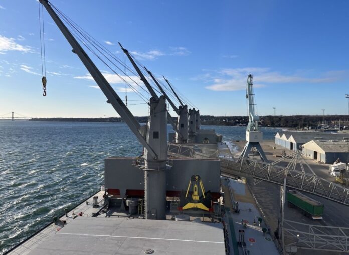 Billeder fra kajen viser et massivt setup med kraner, transportbånd og materiel i drift – et konkret billede på den aktivitet, der fortsat præger Fredericia Havn og understreger havnens rolle som en central logistisk knudepunkt i Danmark.