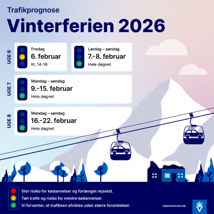 TRAFIK. Starten på skolernes vinterferie kan give ekstra pres på vejene, når mange danskere sætter kursen mod ferieophold i ind- og udland. Ifølge Vejdirektoratet er der især risiko for tæt trafik fredag den 6. februar, hvor udrejsetrafikken falder sammen med den almindelige eftermiddagsmyldretid.